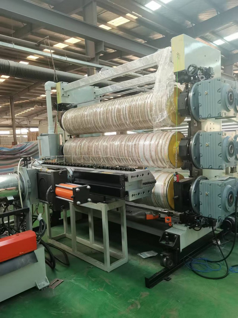 加热塑化:原料进入挤出机的料筒后,料筒外部的加热装置对其进行加热,同时螺杆不断旋转,对原料施加剪切力和摩擦力,使原料在加热和剪切的共同作用下逐渐升温、软化、熔融,从固体状态转变为粘流态。 螺杆推送:旋转的螺杆将熔融的塑料向前推送,在推送过程中,螺杆的不同区段对塑料进行进一步的压缩、搅拌和混合,使塑料的温度和压力更加均匀,塑化效果更好。 挤出成型 塑料片材挤出机价格_塑料片材挤出机价格 模头挤出:熔融塑料被推送至挤出机的模头(机头)处,模头具有特定的形状和尺寸,根据所需片材的宽度、厚度等要求,对熔融塑料进行定型和挤出,使塑料从模头的缝隙或孔口挤出,形成连续的片状熔体。 多层共挤:对于一些需要多层结构的片材,可采用多层共挤技术,通过多个挤出机分别将不同的熔融塑料输送至多层共挤模头中,在模头内将各层塑料均匀地复合在一起,挤出形成多层复合片材。 冷却定型 三辊压光:挤出的片状熔体首先经过三辊压光机,三辊压光机的三个辊筒对片材进行挤压和冷却,使片材表面更加光滑、平整,同时初步定型,控制片材的厚度和宽度。 冷却输送:经过三辊压光后的片材进入冷却输送装置,通常采用冷却辊或冷却水槽等方式,对片材进行进一步的冷却,使片材温度降低,固化成型,达到所需的硬度和强度。 牵引切割